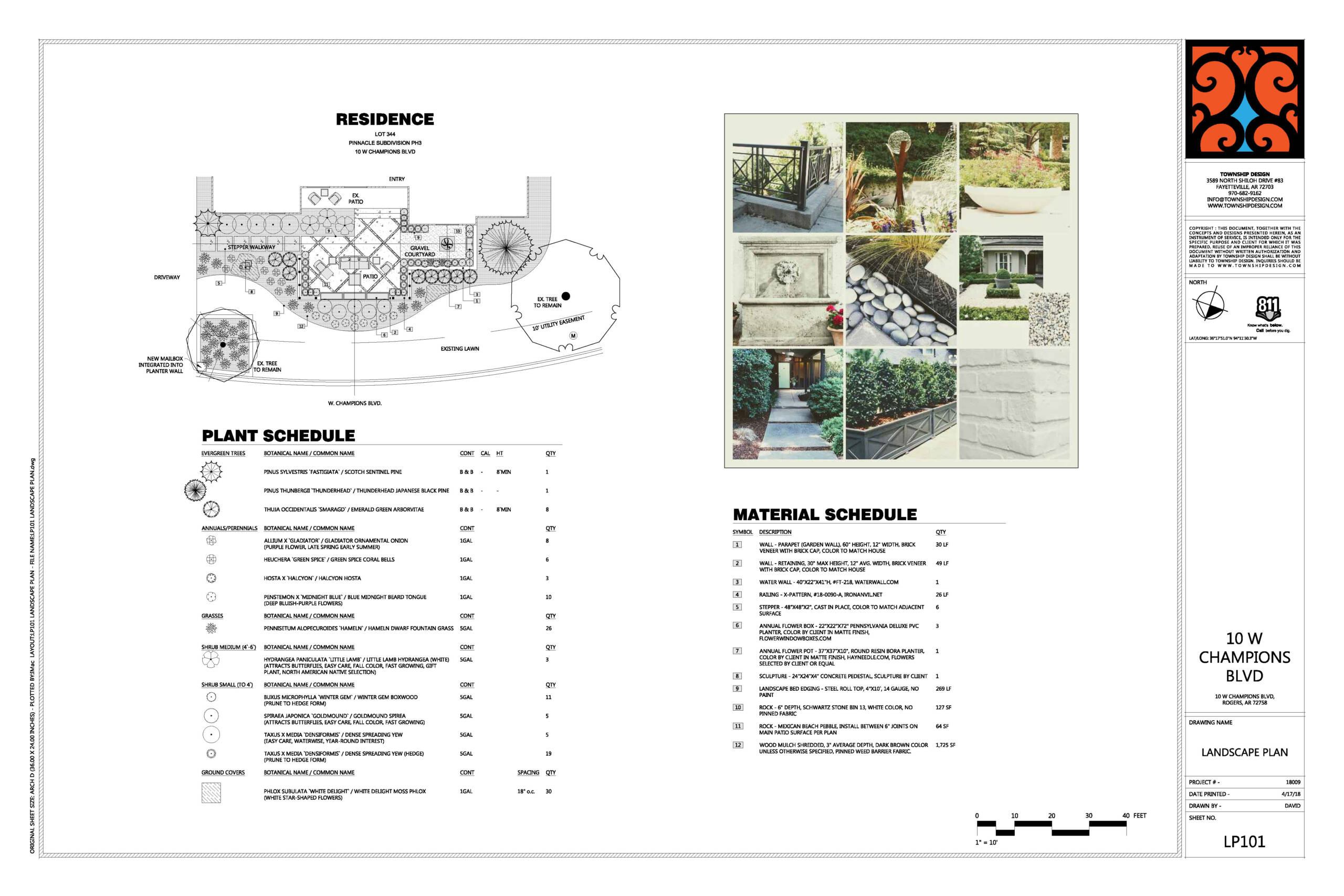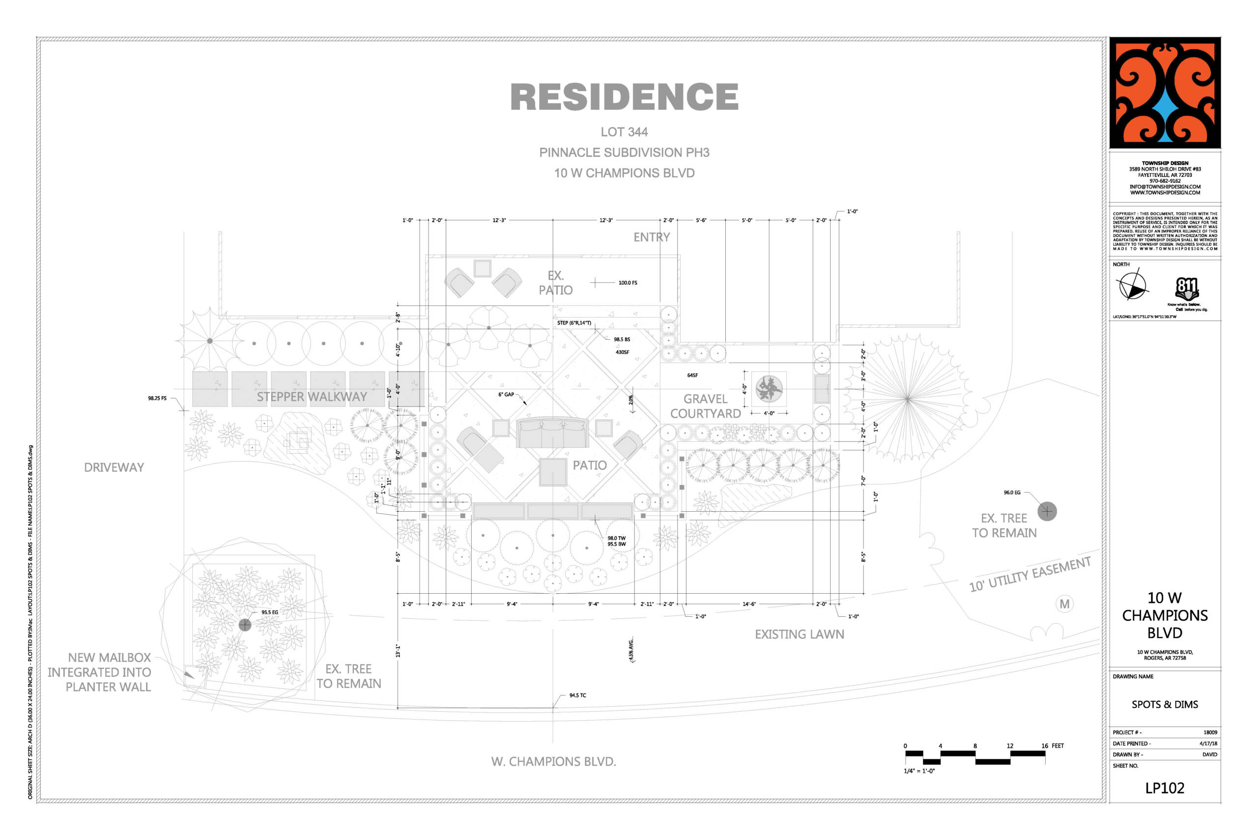 The layout organizes movement from the driveway to the front entry via a stairway, a gravel courtyard, and a central patio. Existing trees were preserved where possible, and plantings were selected for structure, durability, and seasonal interest.