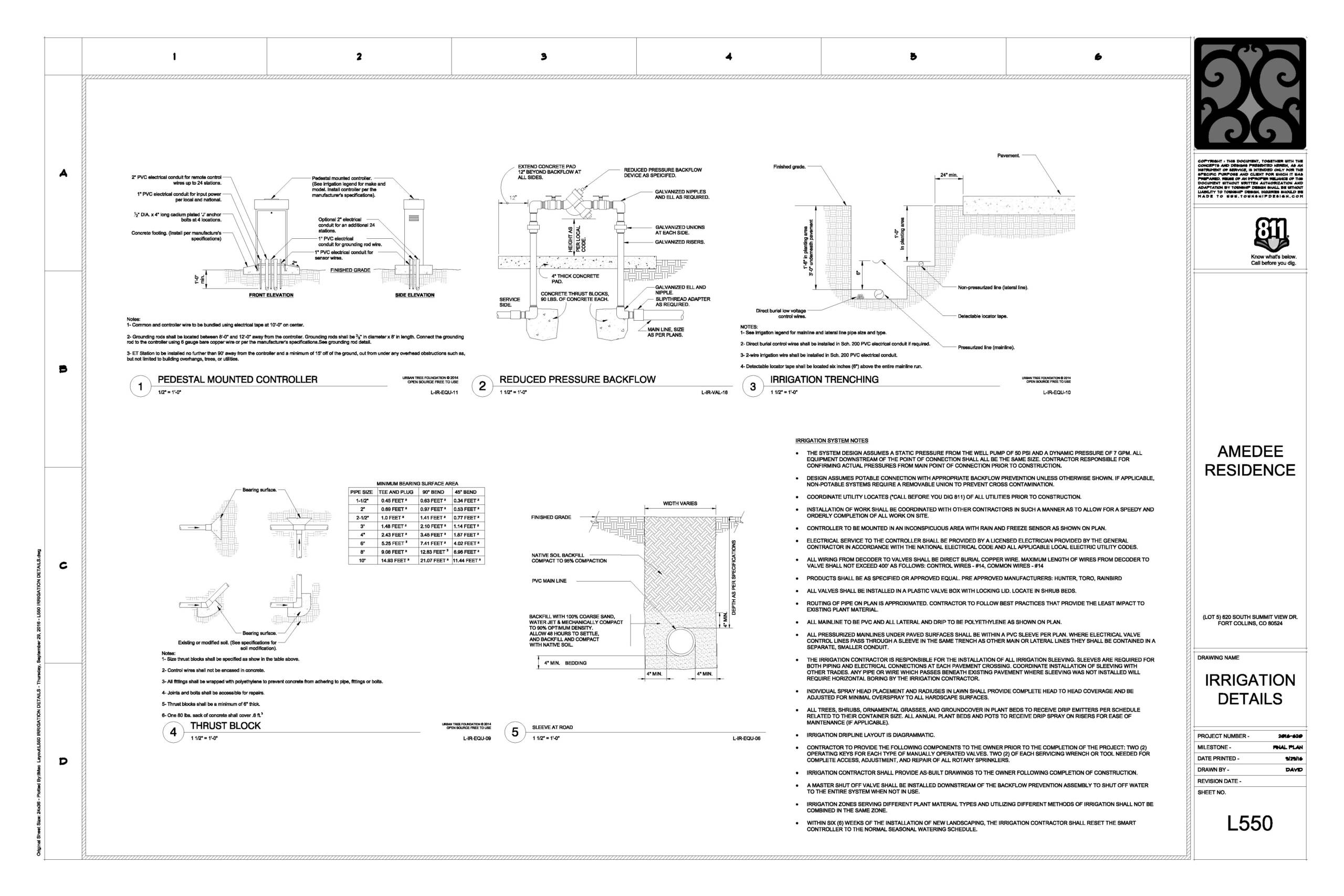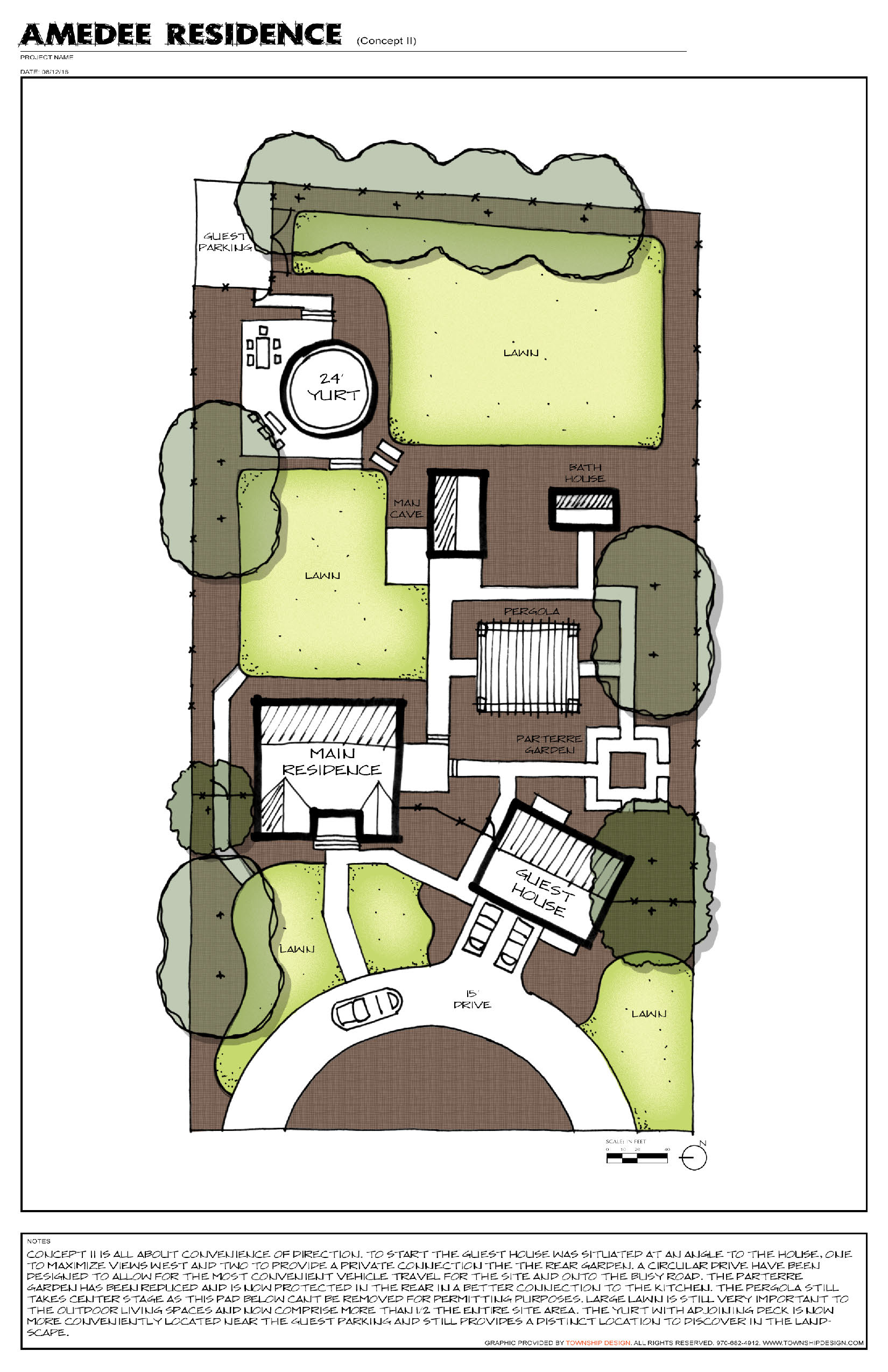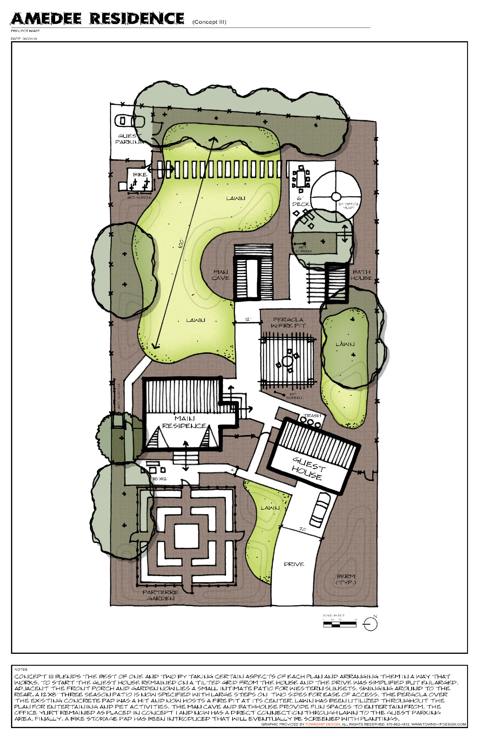 The plan includes a formal parterre entry garden, expansive lawn spaces for recreation and gatherings, pergola entertaining areas, integrated fire pit spaces, guest house access, a detached flexible-use structure, privacy planting, pedestrian pathways, and layered hardscape connections throughout the property. Supporting construction documentation also included hardscape, irrigation, and technical detailing for implementation.