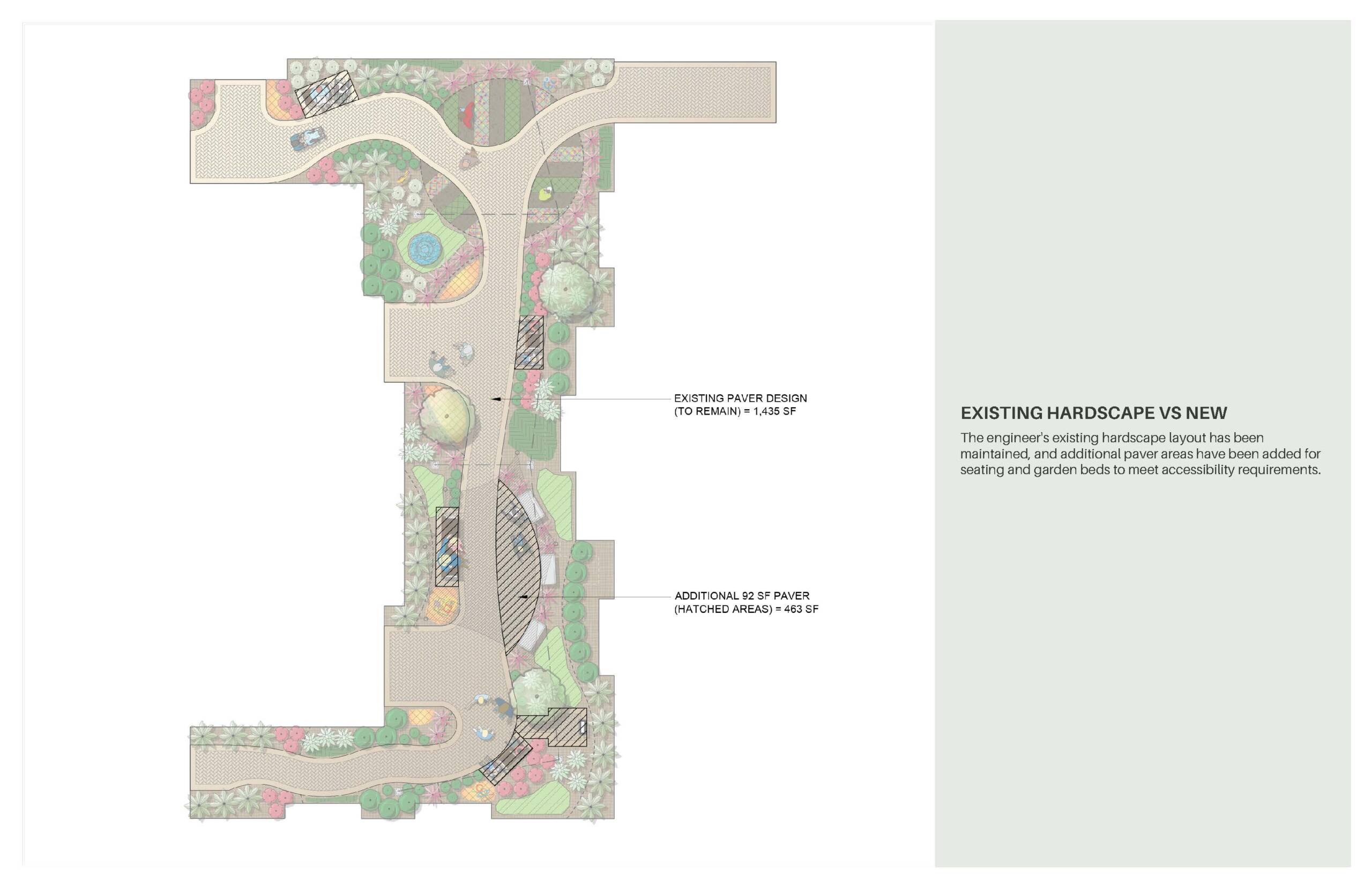 Our design approach emphasized environments that feel gentle and welcoming rather than formal or overly designed. Existing hardscape footprints were largely maintained, with subtle refinements to paving patterns, planting layouts, and circulation to enhance accessibility and visual interest while remaining mindful of permitting and operational requirements.