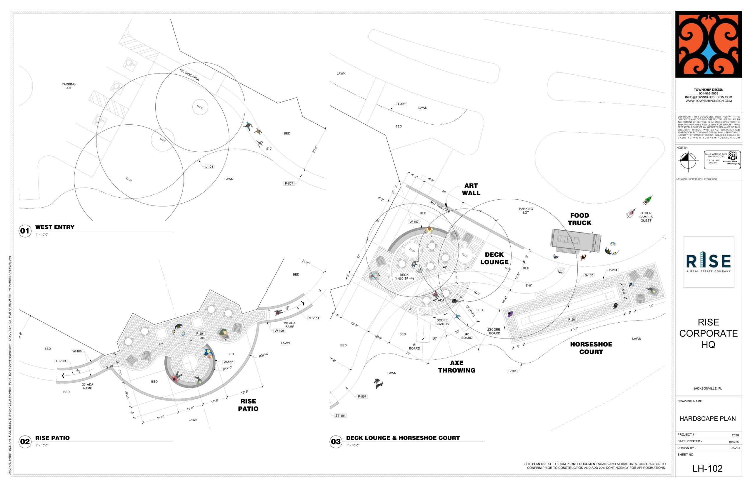 RISE first connected with Alex Reed of R & R Northeast Florida to explore ways to improve the spaces around its Jacksonville headquarters. Shortly after, Alex brought us into the conversation. Following a site visit and lunch, we aligned on a clear goal: create flexible outdoor spaces that support connection, creativity, and everyday use.