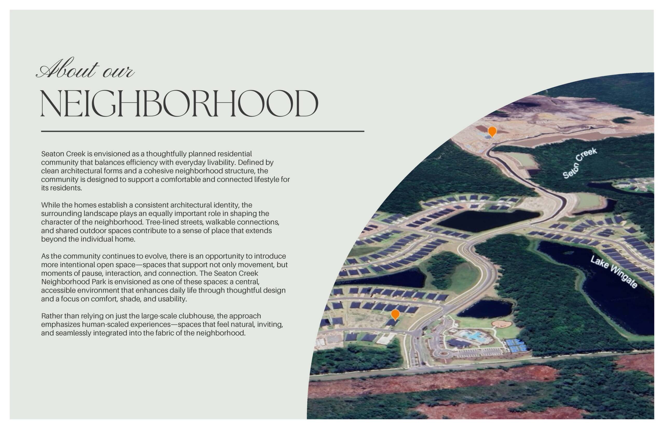 The result is a highly usable and memorable neighborhood amenity that strengthens community identity while enhancing daily life for residents. The park creates a welcoming focal point for Seaton Creek and provides long-term value through thoughtful, human-scaled design.
