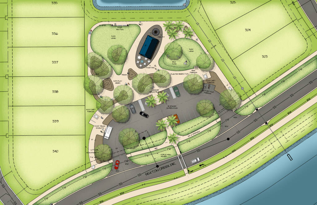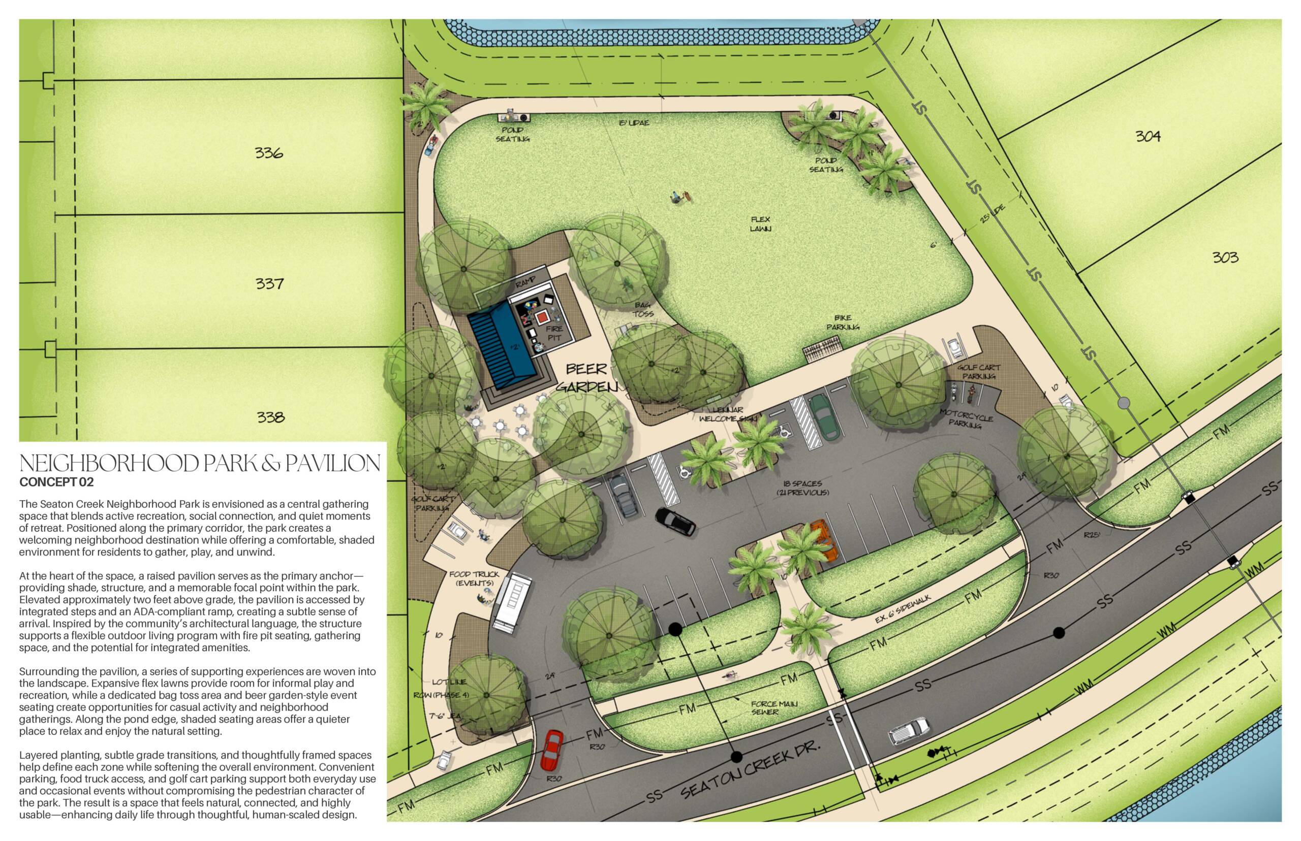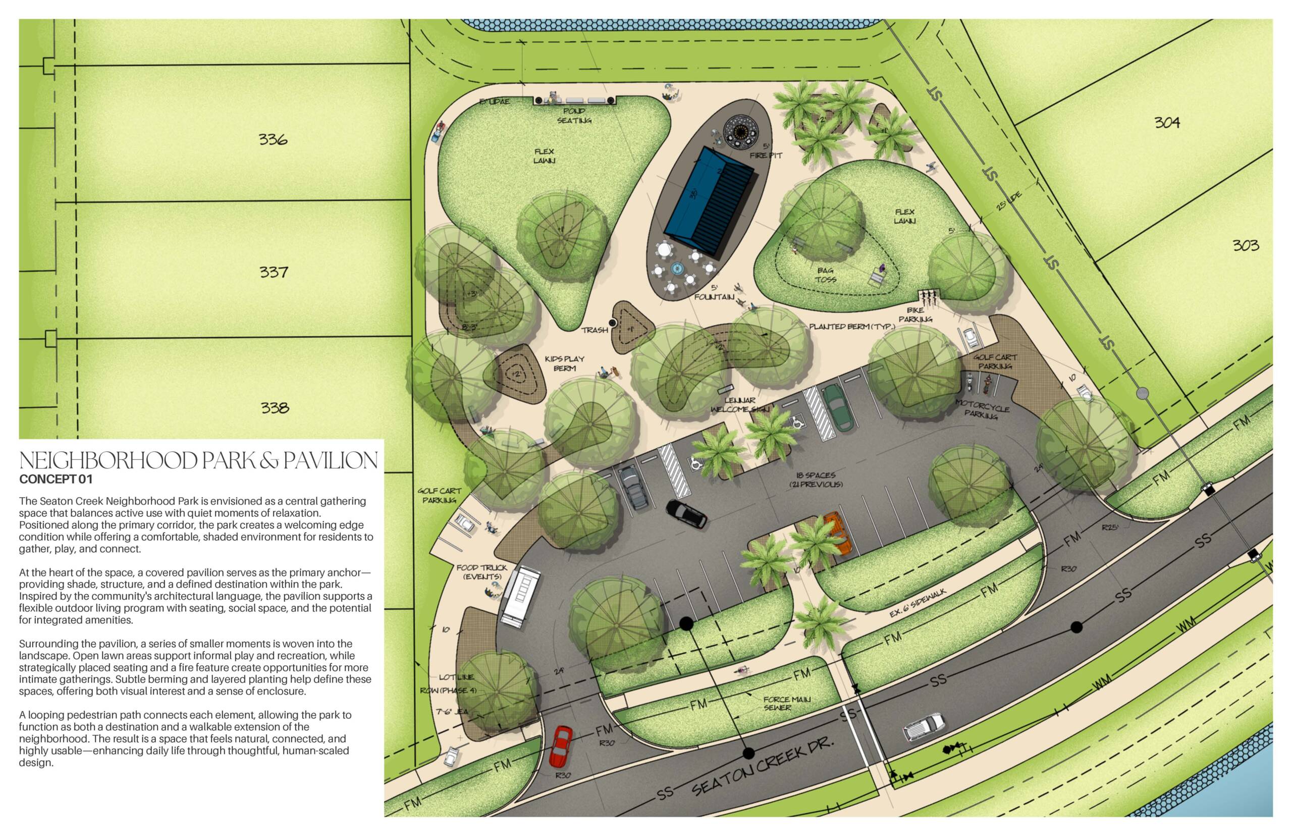 A neighborhood park concept developed as a central gathering space for the Seaton Creek community, designed to balance active recreation with relaxed everyday use. The planning approach focused on creating a welcoming destination that feels connected to the neighborhood while providing flexible spaces for residents of all ages to gather, play, and unwind.