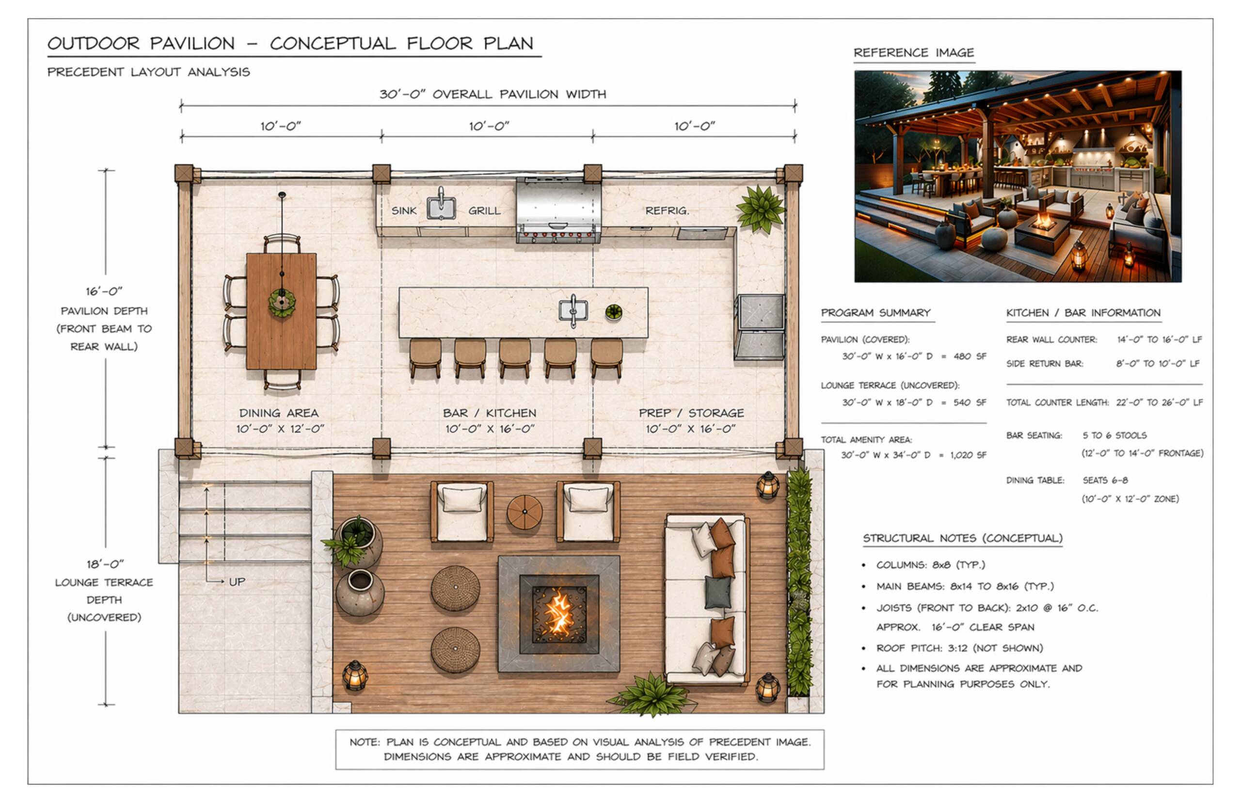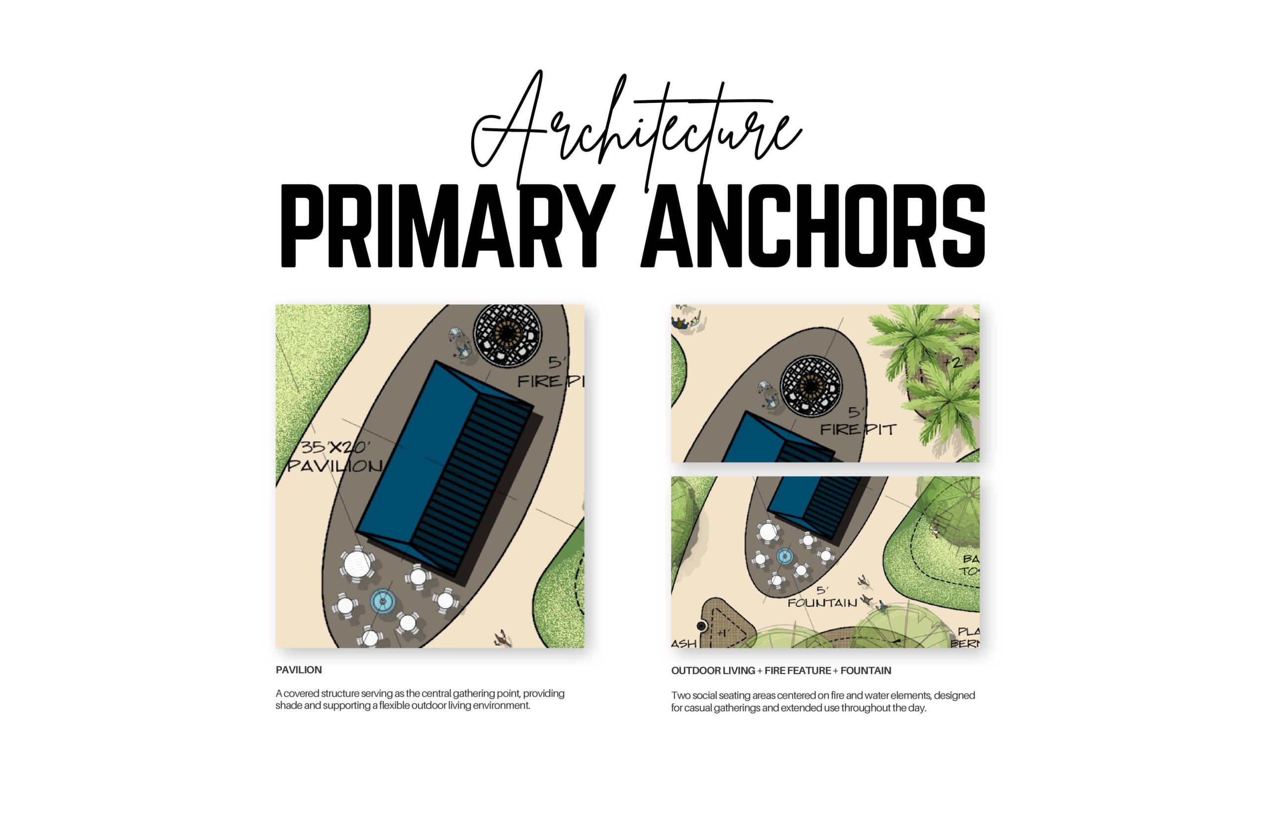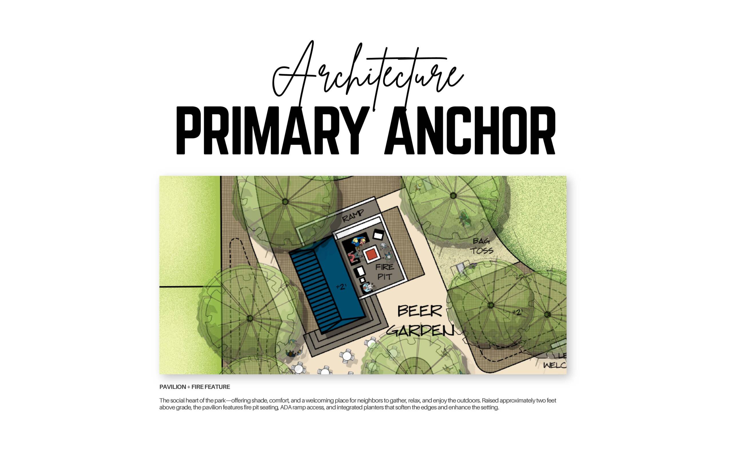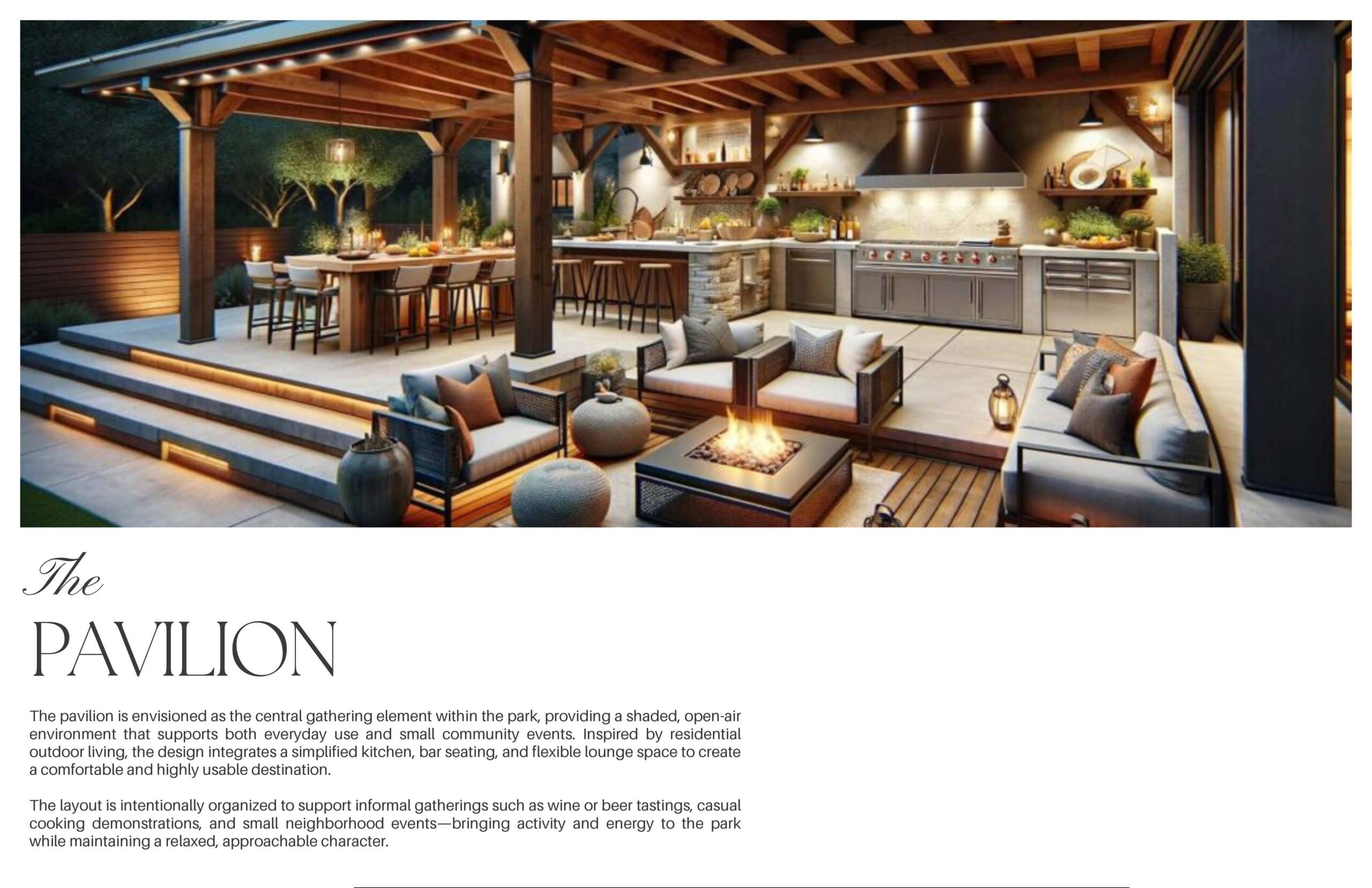 The design includes a covered pavilion as the primary anchor, open lawn areas for informal play and events, looping pedestrian walkways, shaded seating zones, fire feature gathering areas, subtle berming for spatial definition, layered planting for character and comfort, and opportunities for future amenities such as food trucks or programmed community events.